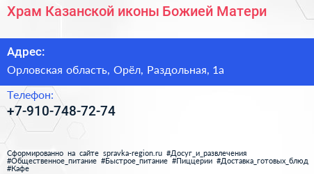 Храм Казанской иконы Божией Матери по адресу Орловская область, Орёл, Раздольная, 1а в дальнейшем Организация, размещена в следующих категориях:
