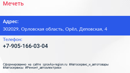 Мечеть по адресу 302029, Орловская область, Орёл, Деповская, 4 в дальнейшем Организация, размещена в следующих категориях: