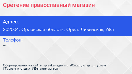 Сретение, православный магазин по адресу 302004, Орловская область, Орёл, Ливенская, 68а в дальнейшем Организация, размещена в следующих категориях: