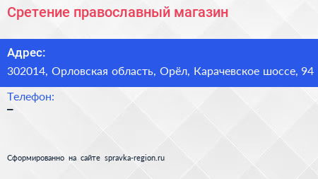 Сретение, православный магазин по адресу 302014, Орловская область, Орёл, Карачевское шоссе, 94 в дальнейшем Организация, размещена в следующих категориях: