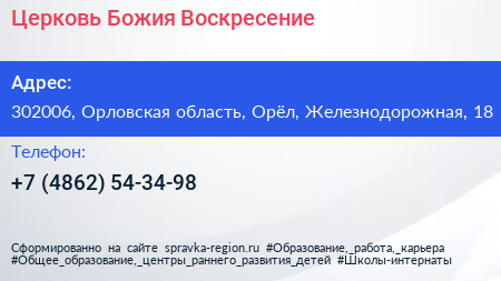 Церковь Божия Воскресение по адресу 302006, Орловская область, Орёл, Железнодорожная, 18 в дальнейшем Организация, размещена в следующих категориях:
