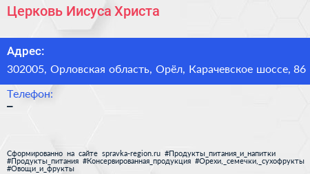Церковь Иисуса Христа по адресу 302005, Орловская область, Орёл, Карачевское шоссе, 86 в дальнейшем Организация, размещена в следующих категориях: