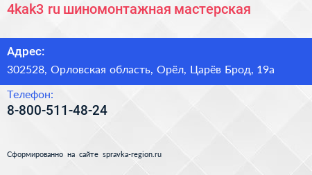 4kak3.ru, шиномонтажная мастерская по адресу 302528, Орловская область, Орёл, Царёв Брод, 19а в дальнейшем Организация, размещена в следующих категориях:
