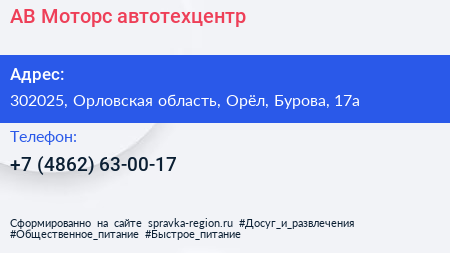 АВ Моторс, автотехцентр по адресу 302025, Орловская область, Орёл, Бурова, 17а в дальнейшем Организация, размещена в следующих категориях: