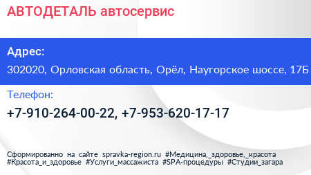 АВТОДЕТАЛЬ, автосервис по адресу 302020, Орловская область, Орёл, Наугорское шоссе, 17Б в дальнейшем Организация, размещена в следующих категориях: