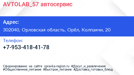AVTOLAB_57, автосервис по адресу 302040, Орловская область, Орёл, Колпакчи, 20 в дальнейшем Организация, размещена в следующих категориях: