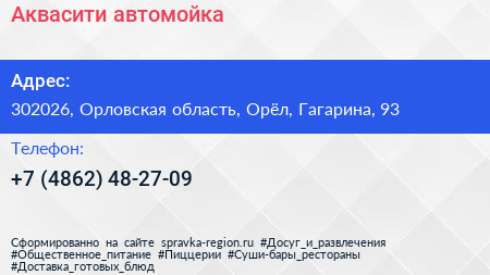 Аквасити, автомойка по адресу 302026, Орловская область, Орёл, Гагарина, 93 в дальнейшем Организация, размещена в следующих категориях: