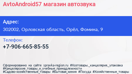 AvtoAndroid57, магазин автозвука по адресу 302002, Орловская область, Орёл, Фомина, 9 в дальнейшем Организация, размещена в следующих категориях: