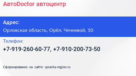 АвтоDoctor, автоцентр по адресу Орловская область, Орёл, Чечневой, 10 в дальнейшем Организация, размещена в следующих категориях: