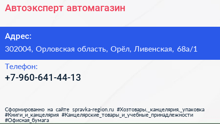 Автоэксперт, автомагазин по адресу 302004, Орловская область, Орёл, Ливенская, 68а/1 в дальнейшем Организация, размещена в следующих категориях: