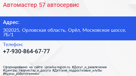 Автомастер 57, автосервис по адресу 302025, Орловская область, Орёл, Московское шоссе, 7Б/1 в дальнейшем Организация, размещена в следующих категориях:
