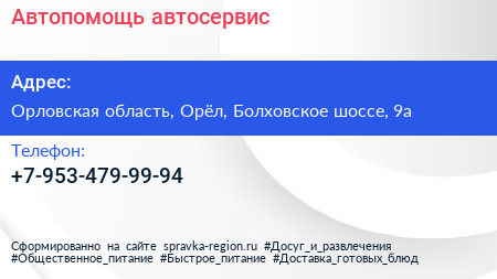 Автопомощь, автосервис по адресу Орловская область, Орёл, Болховское шоссе, 9а в дальнейшем Организация, размещена в следующих категориях: