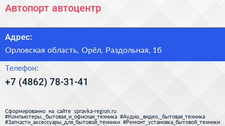Автопорт, автоцентр по адресу Орловская область, Орёл, Раздольная, 1б в дальнейшем Организация, размещена в следующих категориях: