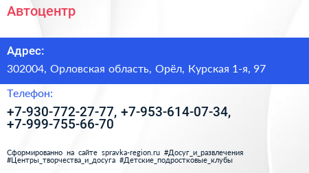 Автоцентр по адресу 302004, Орловская область, Орёл, Курская 1-я, 97 в дальнейшем Организация, размещена в следующих категориях: