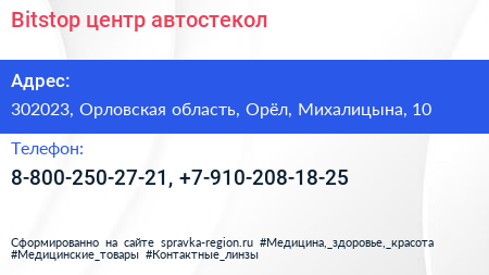 Bitstop, центр автостекол по адресу 302023, Орловская область, Орёл, Михалицына, 10 в дальнейшем Организация, размещена в следующих категориях: