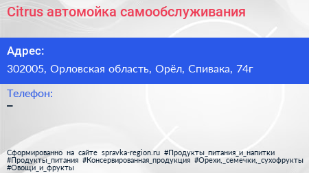 Citrus, автомойка самообслуживания по адресу 302005, Орловская область, Орёл, Спивака, 74г в дальнейшем Организация, размещена в следующих категориях:
