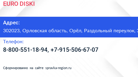 EURO-DISKI по адресу 302023, Орловская область, Орёл, Раздольный переулок, 3 в дальнейшем Организация, размещена в следующих категориях: