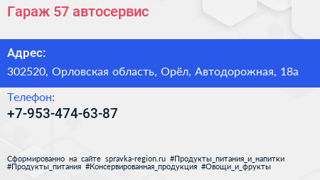 Гараж 57, автосервис по адресу 302520, Орловская область, Орёл, Автодорожная, 18а в дальнейшем Организация, размещена в следующих категориях:
