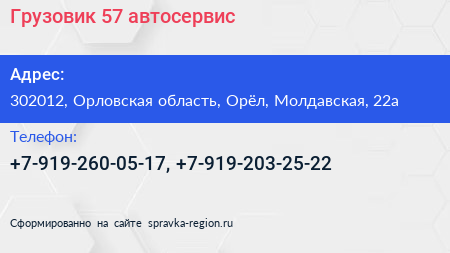 Грузовик 57, автосервис по адресу 302012, Орловская область, Орёл, Молдавская, 22а в дальнейшем Организация, размещена в следующих категориях: