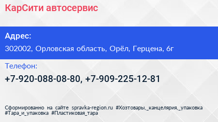 КарСити, автосервис по адресу 302002, Орловская область, Орёл, Герцена, 6г в дальнейшем Организация, размещена в следующих категориях: