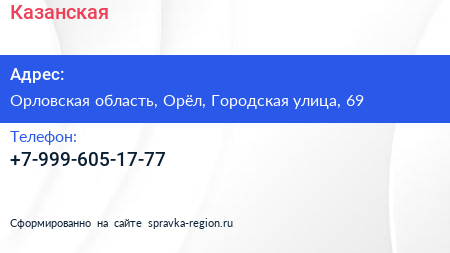 Казанская по адресу Орловская область, Орёл, Городская улица, 69 в дальнейшем Организация, размещена в следующих категориях: