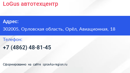 LoGus, автотехцентр по адресу 302005, Орловская область, Орёл, Авиационная, 18 в дальнейшем Организация, размещена в следующих категориях: