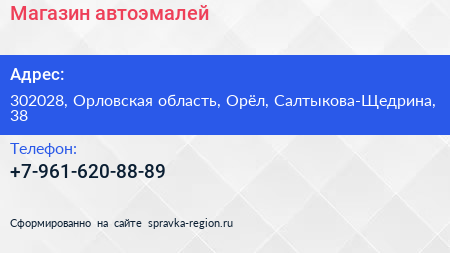 Магазин автоэмалей по адресу 302028, Орловская область, Орёл, Салтыкова-Щедрина, 38 в дальнейшем Организация, размещена в следующих категориях: