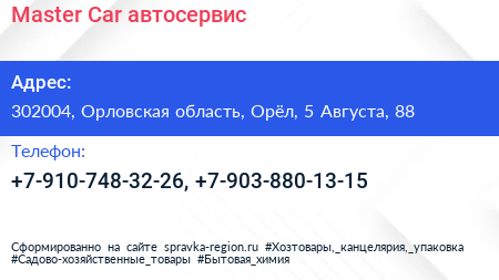 Master Car, автосервис по адресу 302004, Орловская область, Орёл, 5 Августа, 88 в дальнейшем Организация, размещена в следующих категориях: