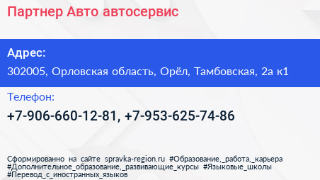 Партнер Авто, автосервис по адресу 302005, Орловская область, Орёл, Тамбовская, 2а к1 в дальнейшем Организация, размещена в следующих категориях: