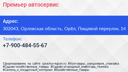 Премьер, автосервис по адресу 302043, Орловская область, Орёл, Пищевой переулок, 14 в дальнейшем Организация, размещена в следующих категориях: