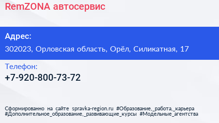 RemZONA, автосервис по адресу 302023, Орловская область, Орёл, Силикатная, 17 в дальнейшем Организация, размещена в следующих категориях: