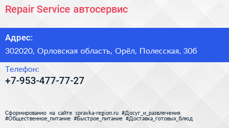 Repair Service, автосервис по адресу 302020, Орловская область, Орёл, Полесская, 30б в дальнейшем Организация, размещена в следующих категориях: