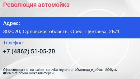Революция, автомойка по адресу 302020, Орловская область, Орёл, Цветаева, 2Б/1 в дальнейшем Организация, размещена в следующих категориях: