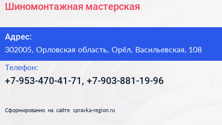 Шиномонтажная мастерская по адресу 302005, Орловская область, Орёл, Васильевская, 108 в дальнейшем Организация, размещена в следующих категориях: