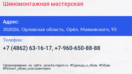 Шиномонтажная мастерская по адресу 302026, Орловская область, Орёл, Маяковского, 93 в дальнейшем Организация, размещена в следующих категориях: