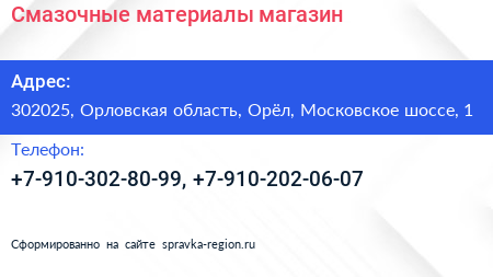 Смазочные материалы, магазин по адресу 302025, Орловская область, Орёл, Московское шоссе, 1 в дальнейшем Организация, размещена в следующих категориях: