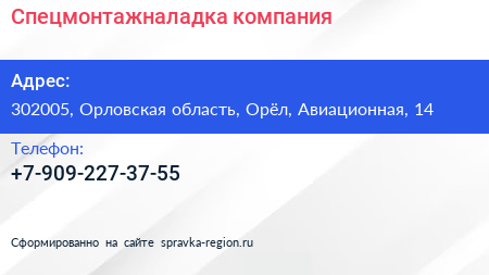 Спецмонтажналадка, компания по адресу 302005, Орловская область, Орёл, Авиационная, 14 в дальнейшем Организация, размещена в следующих категориях: