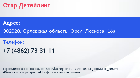 Стар Детейлинг по адресу 302028, Орловская область, Орёл, Лескова, 16а в дальнейшем Организация, размещена в следующих категориях: