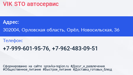 VIK-STO, автосервис по адресу 302004, Орловская область, Орёл, Новосильская, 36 в дальнейшем Организация, размещена в следующих категориях: