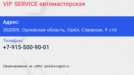 VIP SERVICE, автомастерская по адресу 302009, Орловская область, Орёл, Северная, 9 ст6 в дальнейшем Организация, размещена в следующих категориях: