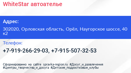 WhiteStar, автоателье по адресу 302020, Орловская область, Орёл, Наугорское шоссе, 40 к2 в дальнейшем Организация, размещена в следующих категориях: