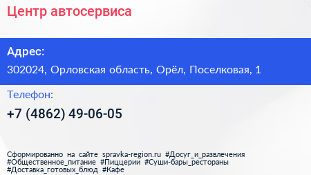 Центр автосервиса по адресу 302024, Орловская область, Орёл, Поселковая, 1 в дальнейшем Организация, размещена в следующих категориях: