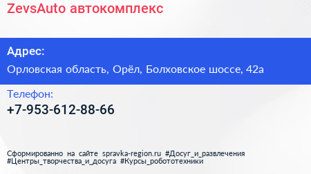ZevsAuto, автокомплекс по адресу Орловская область, Орёл, Болховское шоссе, 42а в дальнейшем Организация, размещена в следующих категориях:
