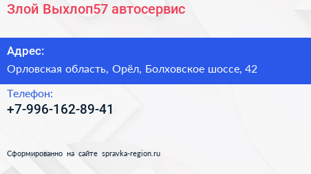 Злой Выхлоп57, автосервис по адресу Орловская область, Орёл, Болховское шоссе, 42 в дальнейшем Организация, размещена в следующих категориях: