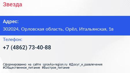 Звезда по адресу 302024, Орловская область, Орёл, Итальянская, 1в в дальнейшем Организация, размещена в следующих категориях: