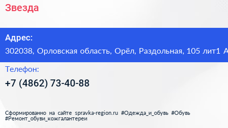 Звезда по адресу 302038, Орловская область, Орёл, Раздольная, 105 лит1 А в дальнейшем Организация, размещена в следующих категориях: