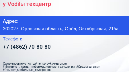 у Vodilы, техцентр по адресу 302027, Орловская область, Орёл, Октябрьская, 215а в дальнейшем Организация, размещена в следующих категориях: