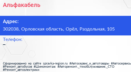 Альфакабель по адресу 302038, Орловская область, Орёл, Раздольная, 105 в дальнейшем Организация, размещена в следующих категориях: