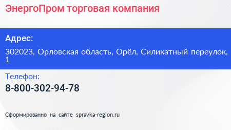 ЭнергоПром, торговая компания по адресу 302023, Орловская область, Орёл, Силикатный переулок, 1 в дальнейшем Организация, размещена в следующих категориях: