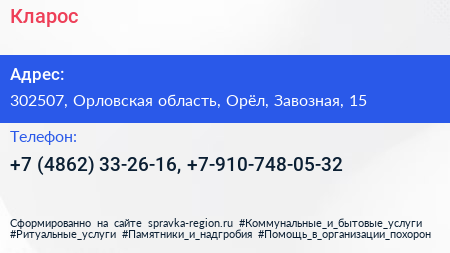 Кларос по адресу 302507, Орловская область, Орёл, Завозная, 15 в дальнейшем Организация, размещена в следующих категориях: